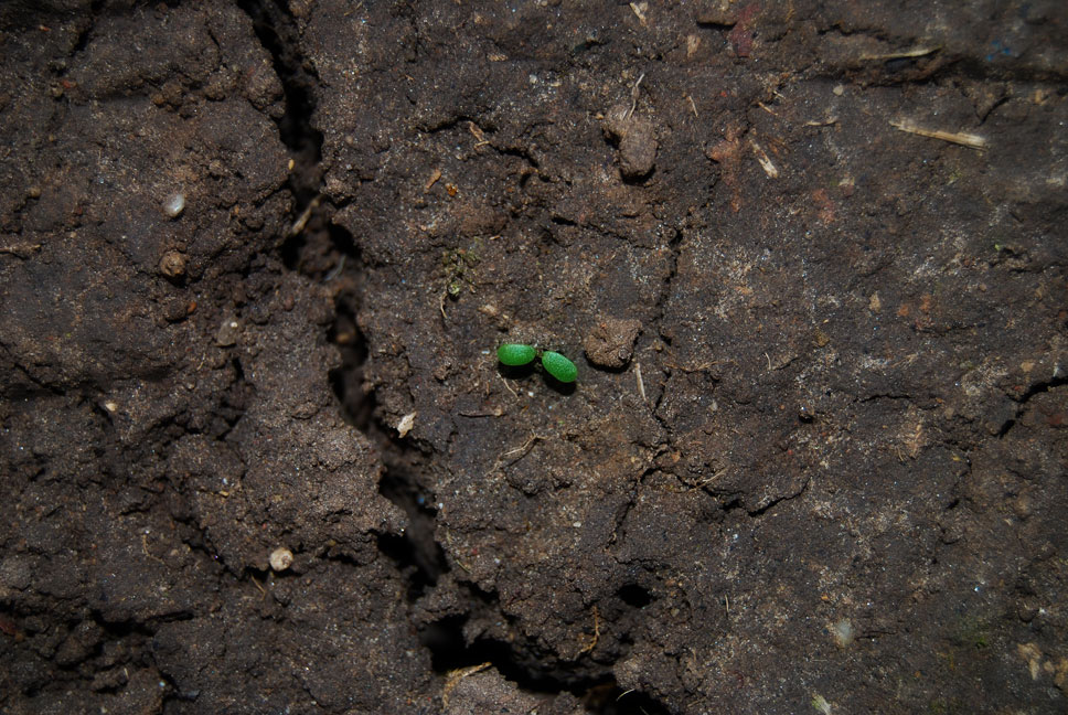 We’re returfing our lawn and now that all the grass is gone tiny little sprouts are trying to invade. The pic is a bit deceiving since this little guy is about this [–] big. It was amazing I saw it at all 🙂